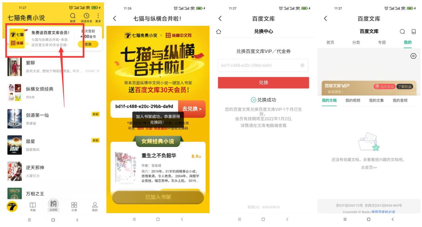 下载七猫小说APP,首页顶部“免费送百度文库会员”,