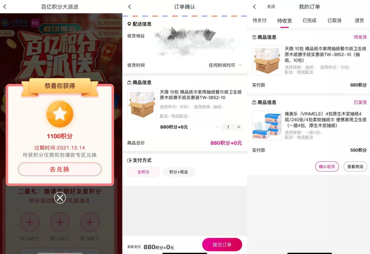 亲测中了1000积分,兑换积分的页面进不去就通过【和包APP】进去,亲测兑换了20包抽纸~