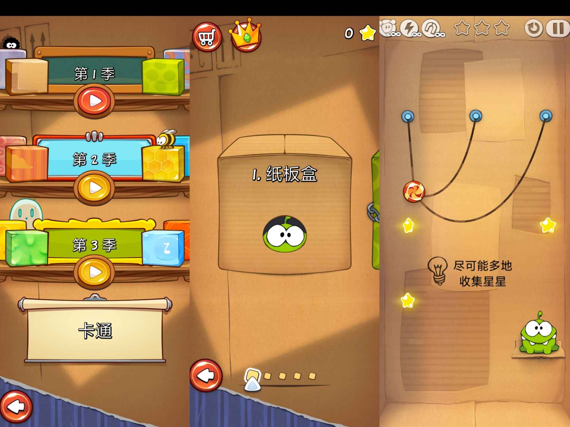 一款益智游戏,游戏选关界面用盒子来代替章节,更显出开发者的用心,整个游戏采用触点操控方式,玩家需要割断绳子把糖果送到 om nom口中,并收集金色星星,发现隐藏的画作并解锁新的关卡,每个主题都都有25个设计巧妙的关卡,让游戏可玩性增加,修改无限道具!