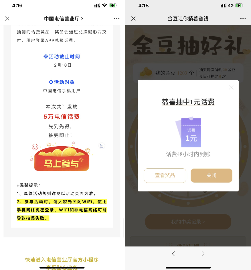 电信抽1~5元话费