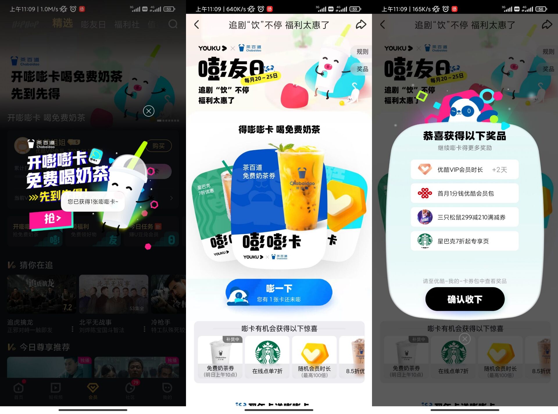 打开优酷APP->底部会员->弹窗嘭一下【不是会员的 点击不开通也可以抽奖】