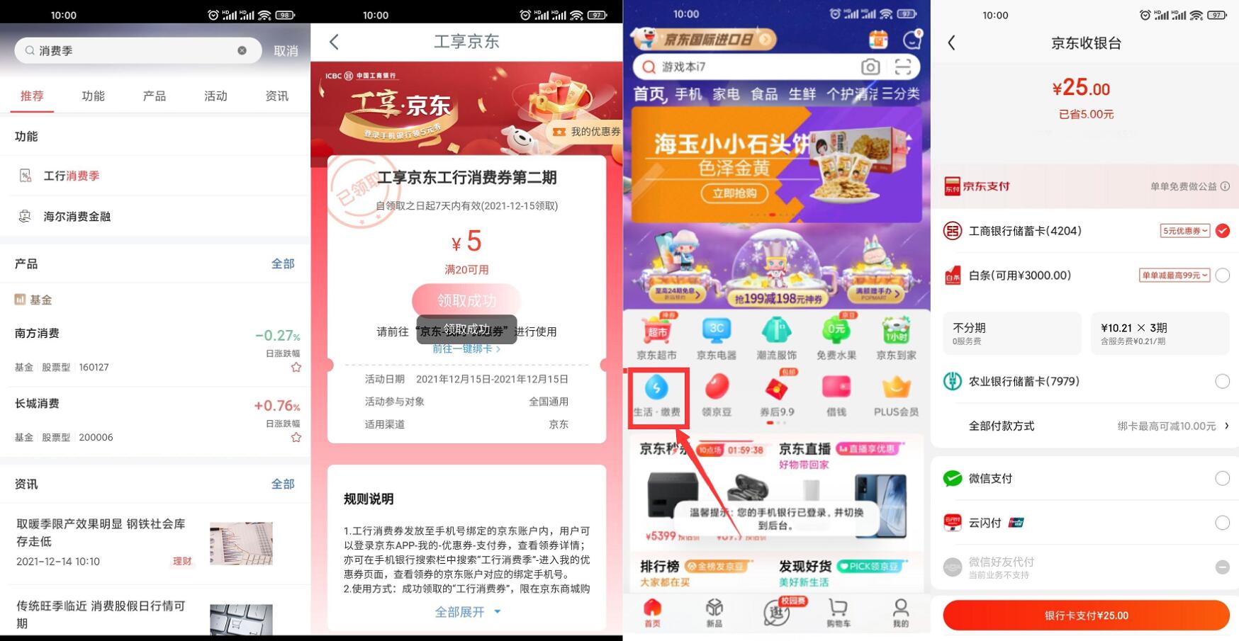 工商银行APP搜索“工行消费季”->点功能进去后直接领取->然后在京东APP首页->“生活缴费”->充30话费->选择工行卡就会减5元->也可以在京东买实物->全场通用的->优惠券有效期到12月27日->券只限今天领取!