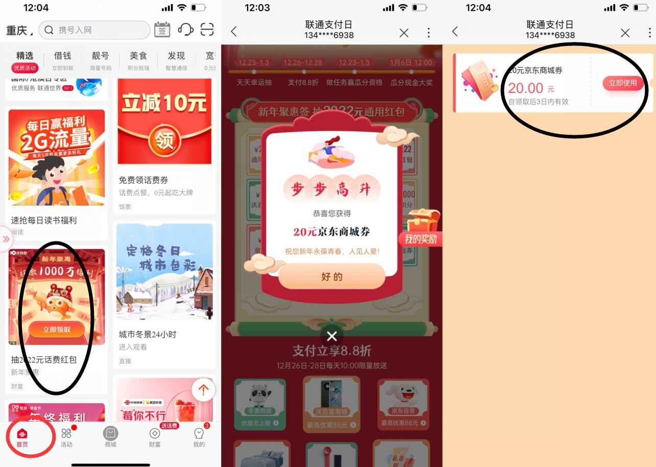 联通APP-首页-精选下拉至【抽2022元话费红包】