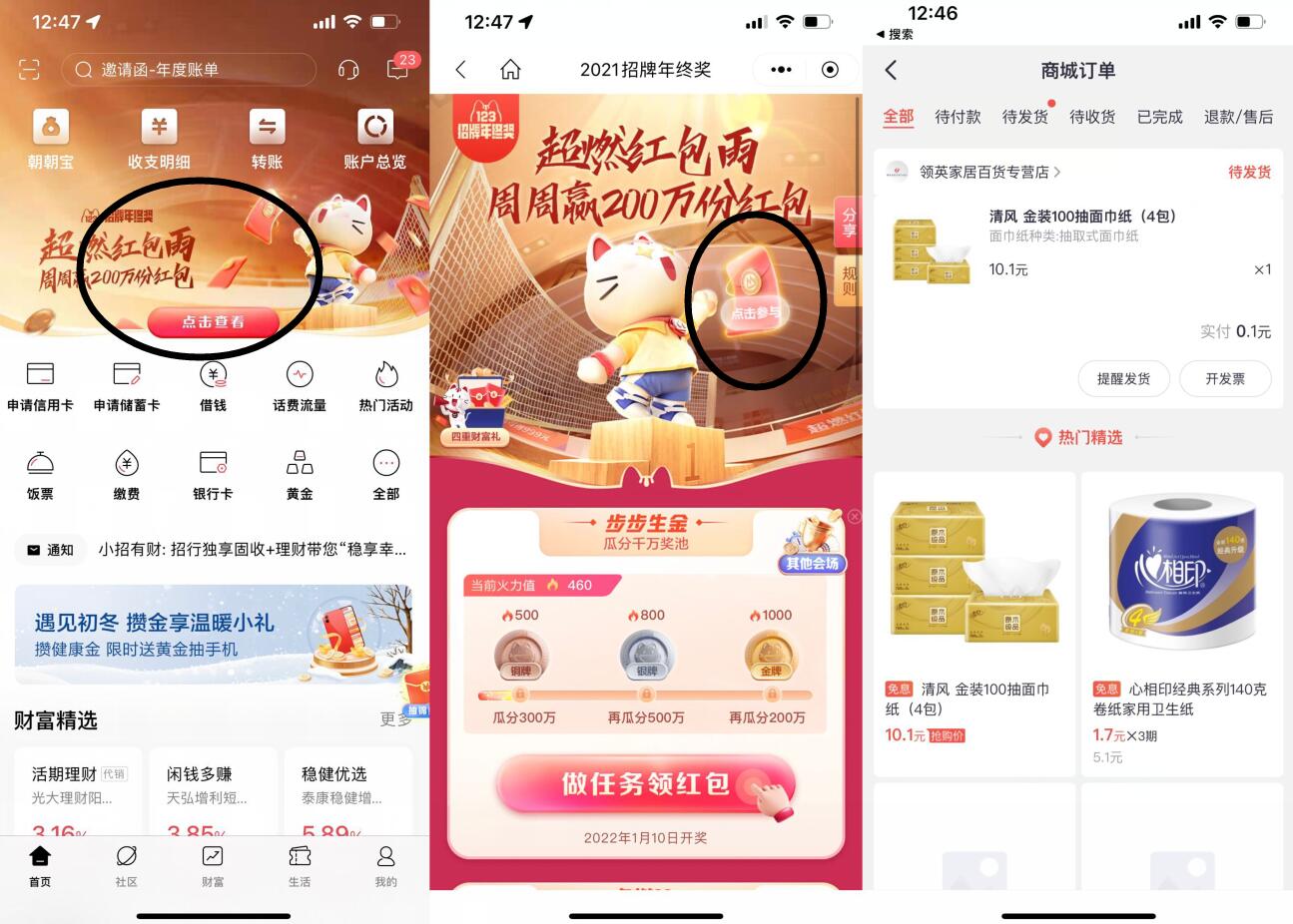 招商银行老用户抽10元商城券 可0.01撸抽纸