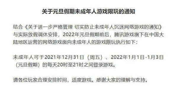 腾讯近日发布关于未成年人元旦游戏时间:未成年人可于2021年12月31日(周五)