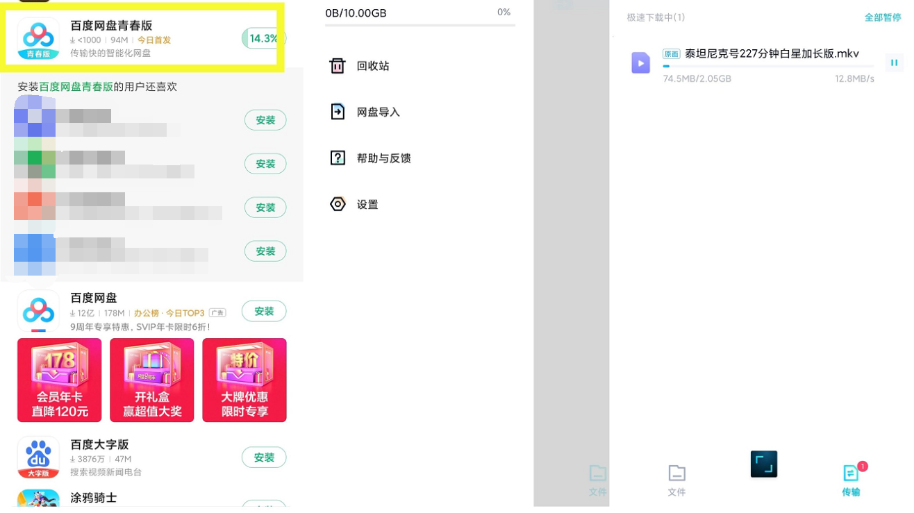 【百度网盘青春版今天正式上线】在各大应用平台搜索“百度网盘青春版”即可下载,存储的文件不可分享,上传下载速度很快,界面非常清爽,提供10GB免费空间,使用同一账号登录后可将标准版存储的文件导入。但是这个导入功能也非常鸡肋,每个账号目前只有三次的导入机会,用完就没了。