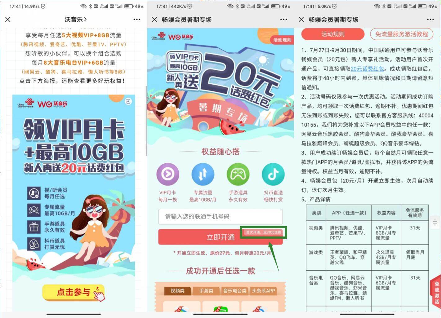 先用20元话费开通业务,然后会送你20元话费秒到,再去选个视频会员月卡,然后退订业务即可