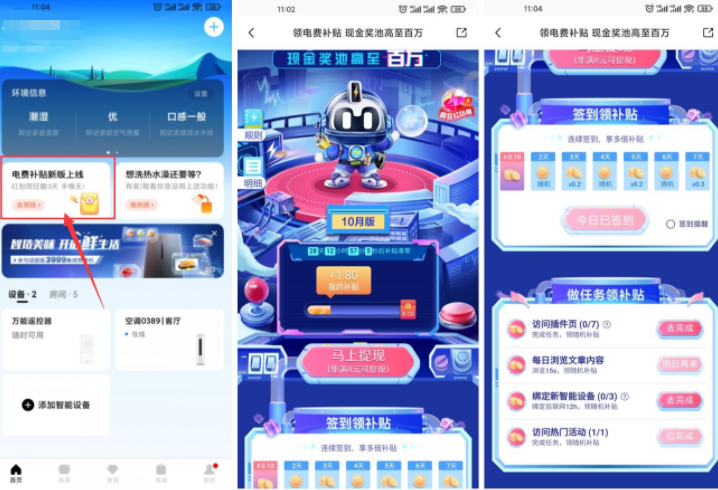 应用商店下载美的美居APP->首页上面“电费补贴”