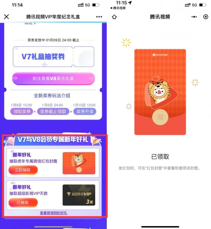 下拉找到“专属新年好礼”,抽微信红包封面和3天超级影视会员