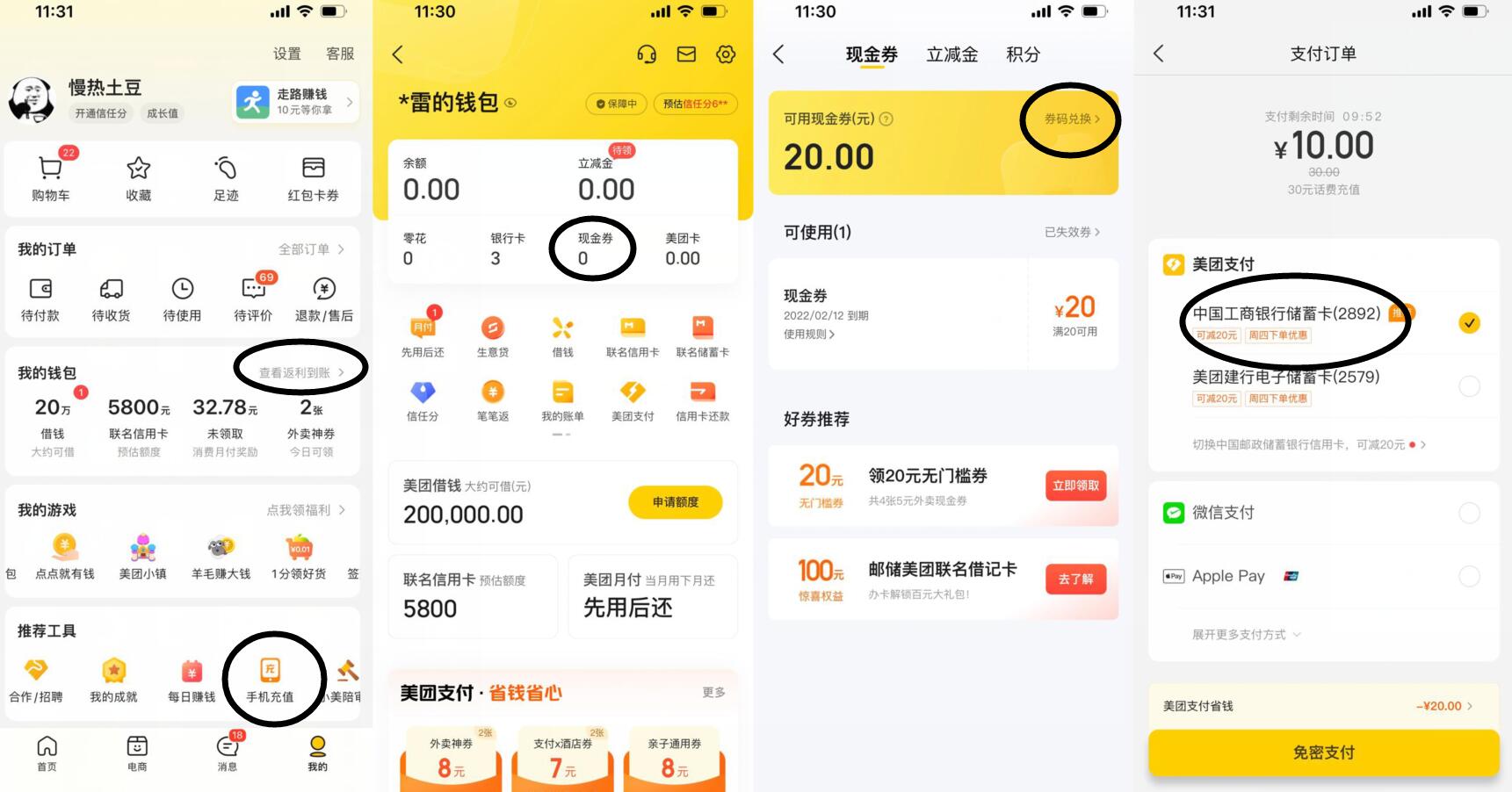 也可以在美团里面冲花费,选择银行卡支付,就可以!