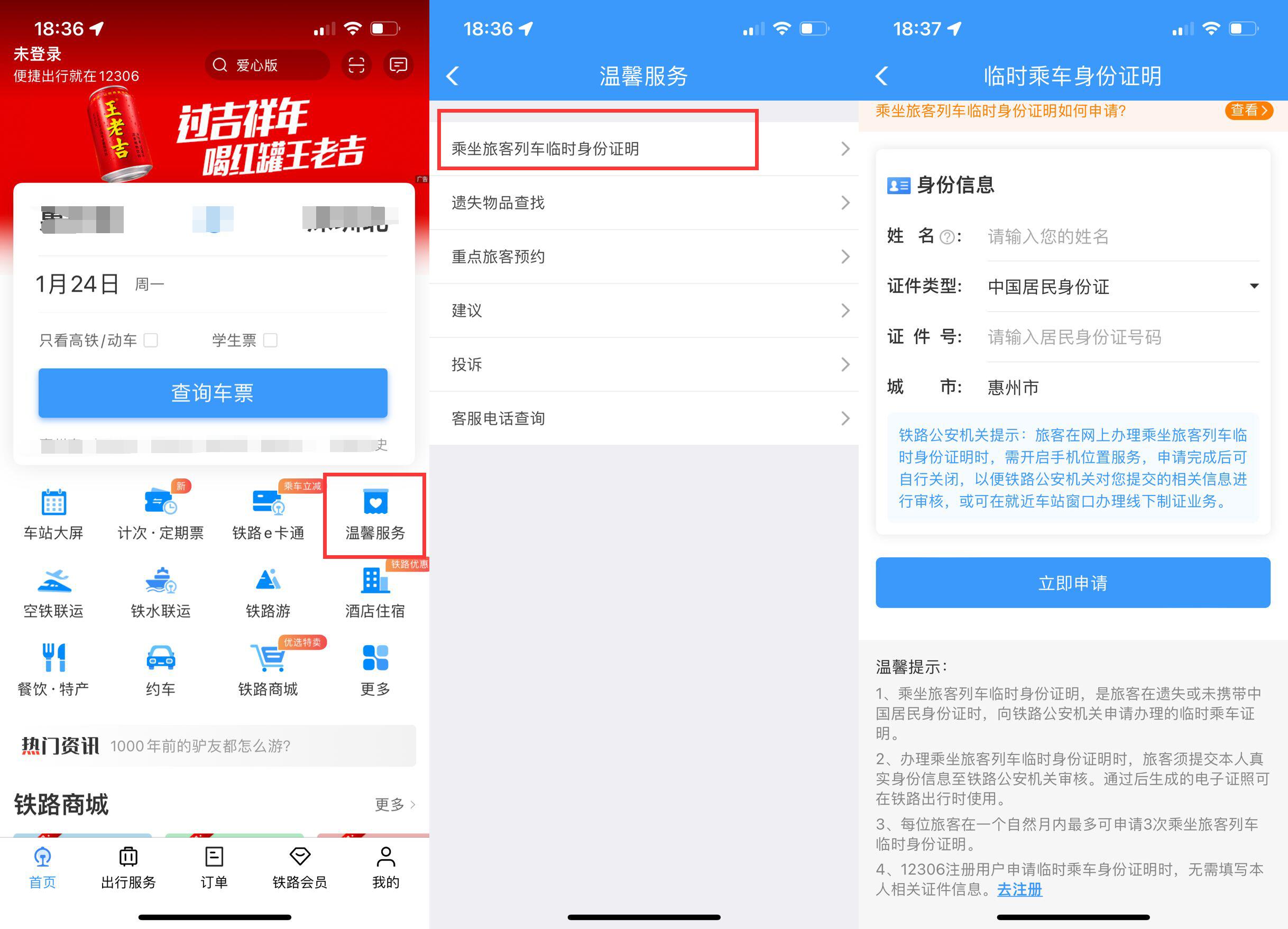 【12306能开电子临时乘车身分征明了】今日起,旅客遗失或未携带身分征时,可在12306手机APP上在线提交电子临时乘车身分征明申请,通过后即可在车站完成购票、退、改签、进站、检票等业务服务。具体方法:12306APP->首页->更多->下拉找到->温馨服务->临时身分征明->提交申请即可!这个功能才出的挺不错!