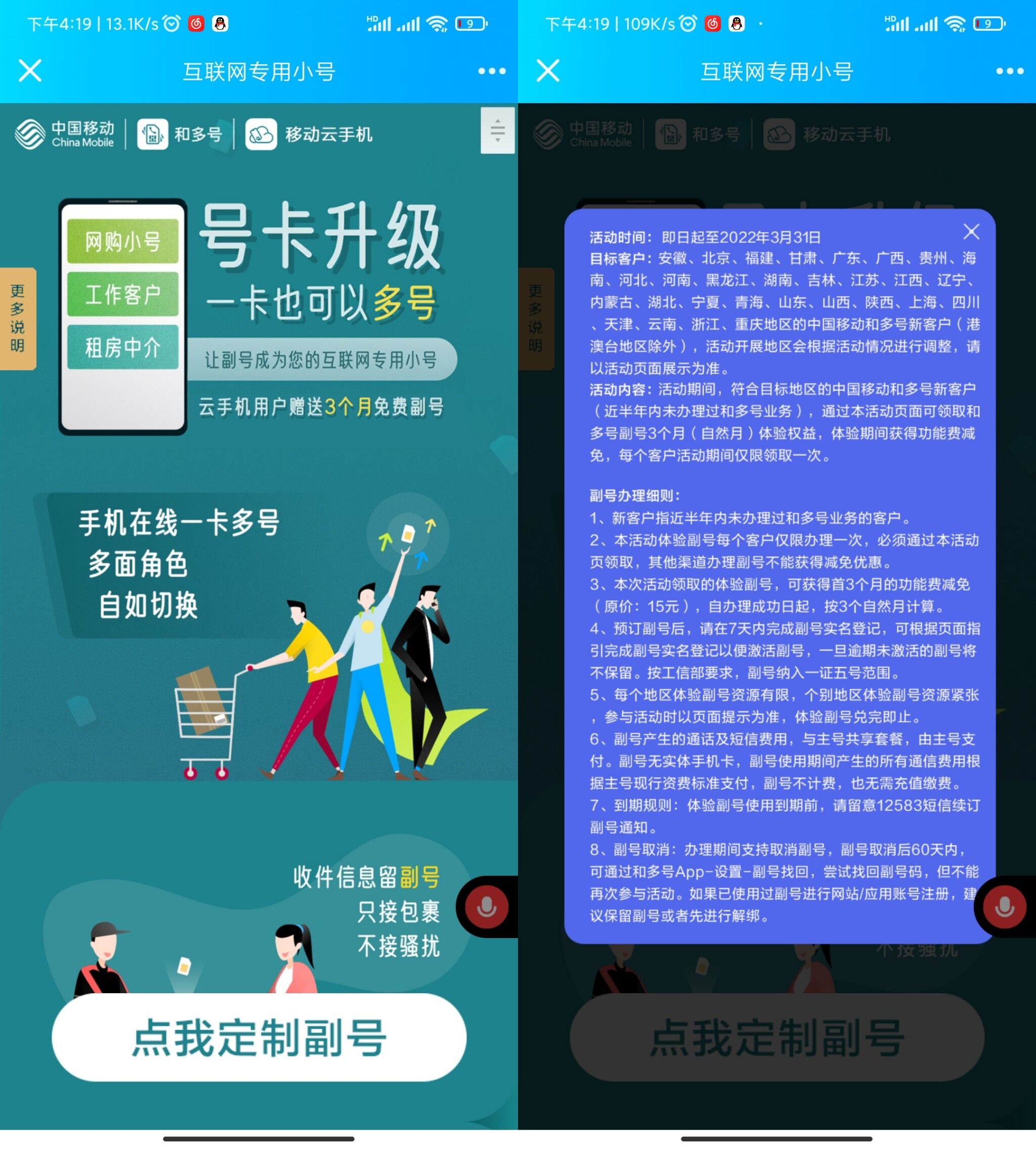【移动免费领3个月和多号】相当于手机号的小号,可以用来接验证码啥的,具体看页面规则介绍,到期不续订自动取消!