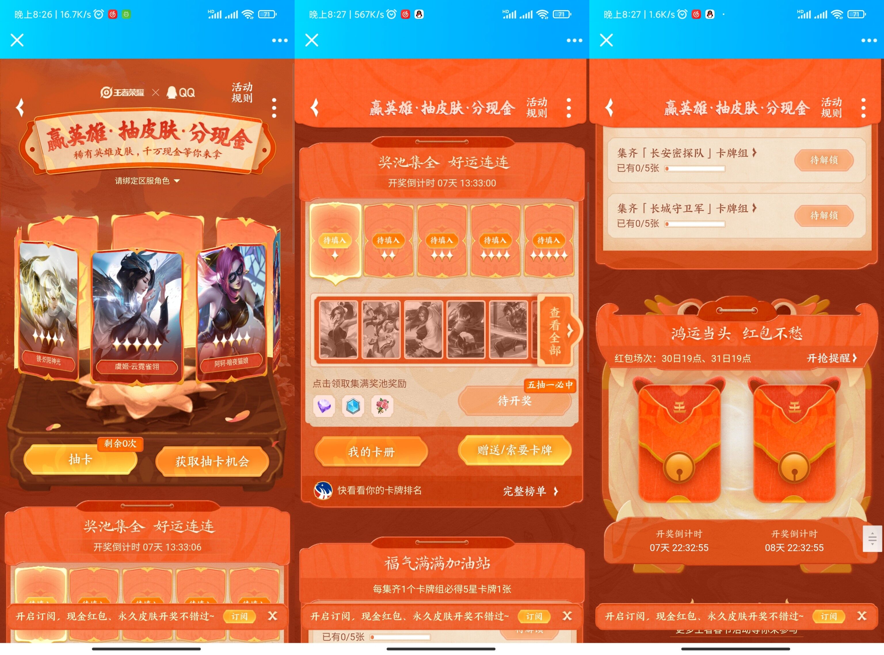 【王者荣耀抽英雄皮肤红包】王者春节QQ活动->手机QQ打开后每天做任务抽卡->等到1月30日就可以抽稀有英雄/皮肤->1月30日19点~1月31日22点期间还有两次抽红包机会!https://youxi.gamecenter.qq.com/gcact/2022-spring/sgame/index.html?ADTAG=adtag.pc&pcQrCode=1