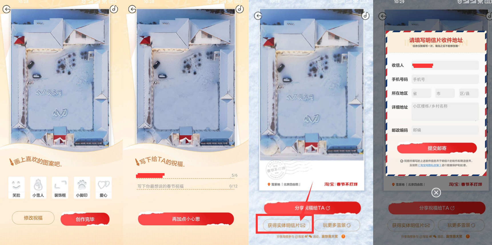 【淘宝免费领实物明信片包邮】补货了,没领到的去!手机淘宝搜索“淘宝下雪了”->进去后点跳过->跟着提示写->最后提交->获得实体明信片->填写地址等待邮寄即可~