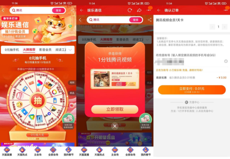 1、手机淘宝扫码进入->点击抽奖三次机会->只认抽中腾讯