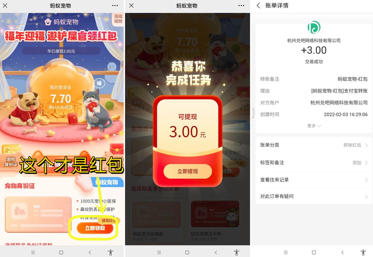 按照提示关注公众号->首先会领个7元红包(这个红包无视,继续跟着走)->点右下角立即领取->登录后随便上传一张猫狗照片(百度搜就行)->领了后返回活动就会提示3元->体现秒到!