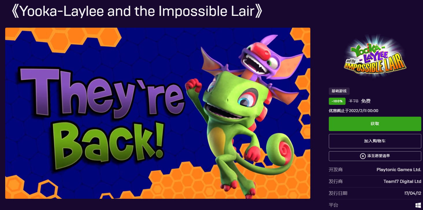 【Epic喜+1】免费领取电脑游戏《尤卡莱莉与无妄巢穴》,一款孤岛求生题材的角色扮演游戏,领取时间截止到2月11日0点。https://www.epicgames.com/store/zh-CN/p/yooka-laylee-and-the-impossible-lair