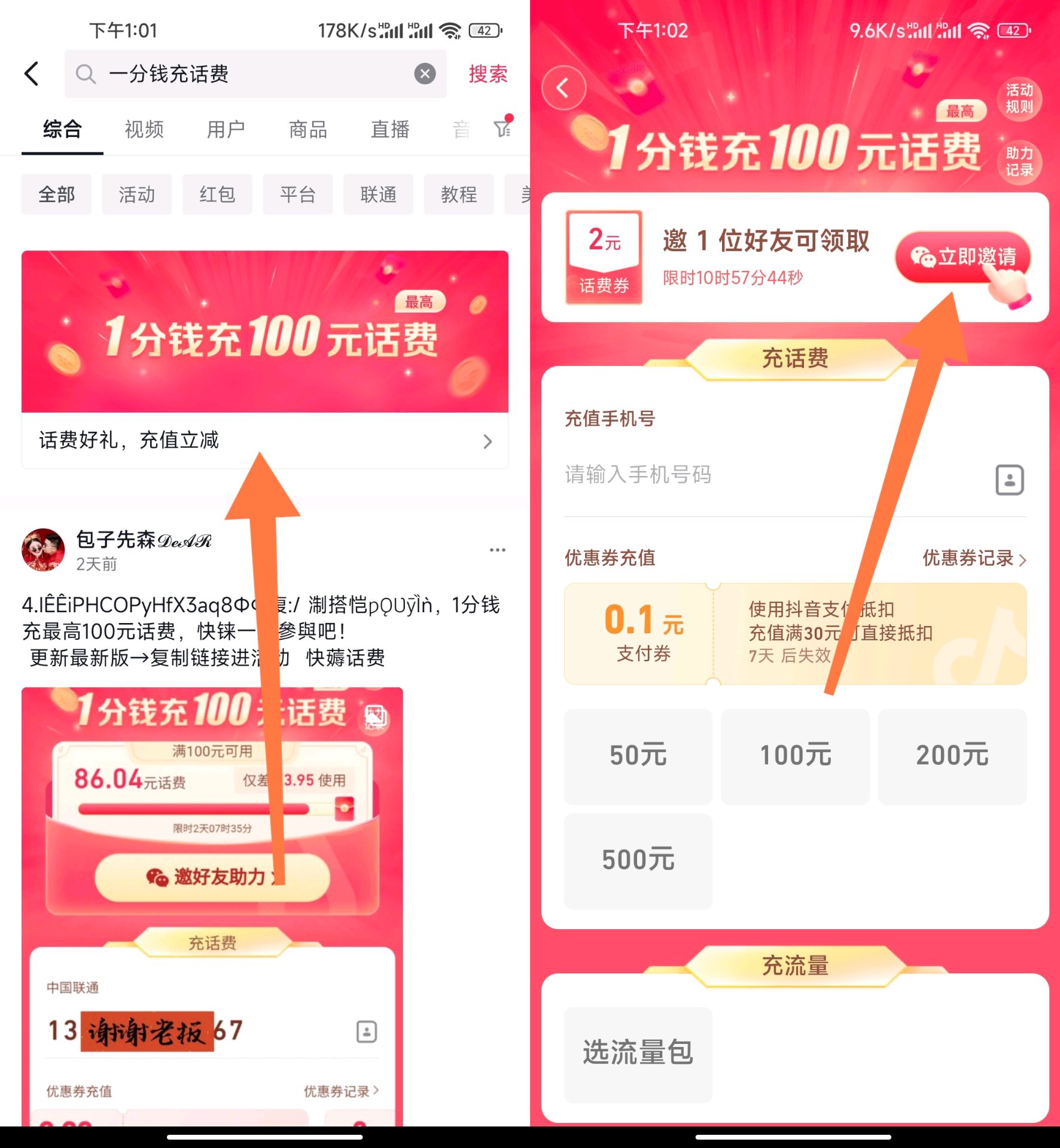 1、抖音APP->搜索“1分钱充话费”进入->先邀请1人领10-2元话费券