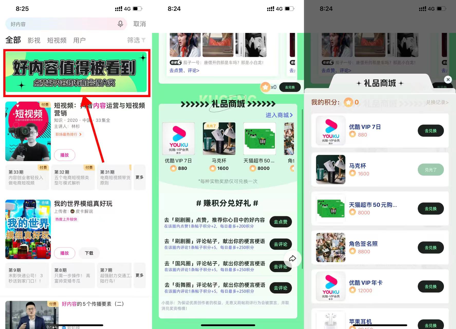 【优酷做任务兑换会员或猫超卡】优酷APP->搜索“好内容”->点击横幅进入->下拉页面做任务->每天最多可得950积分->累计积分可兑换优酷会员或猫超卡!