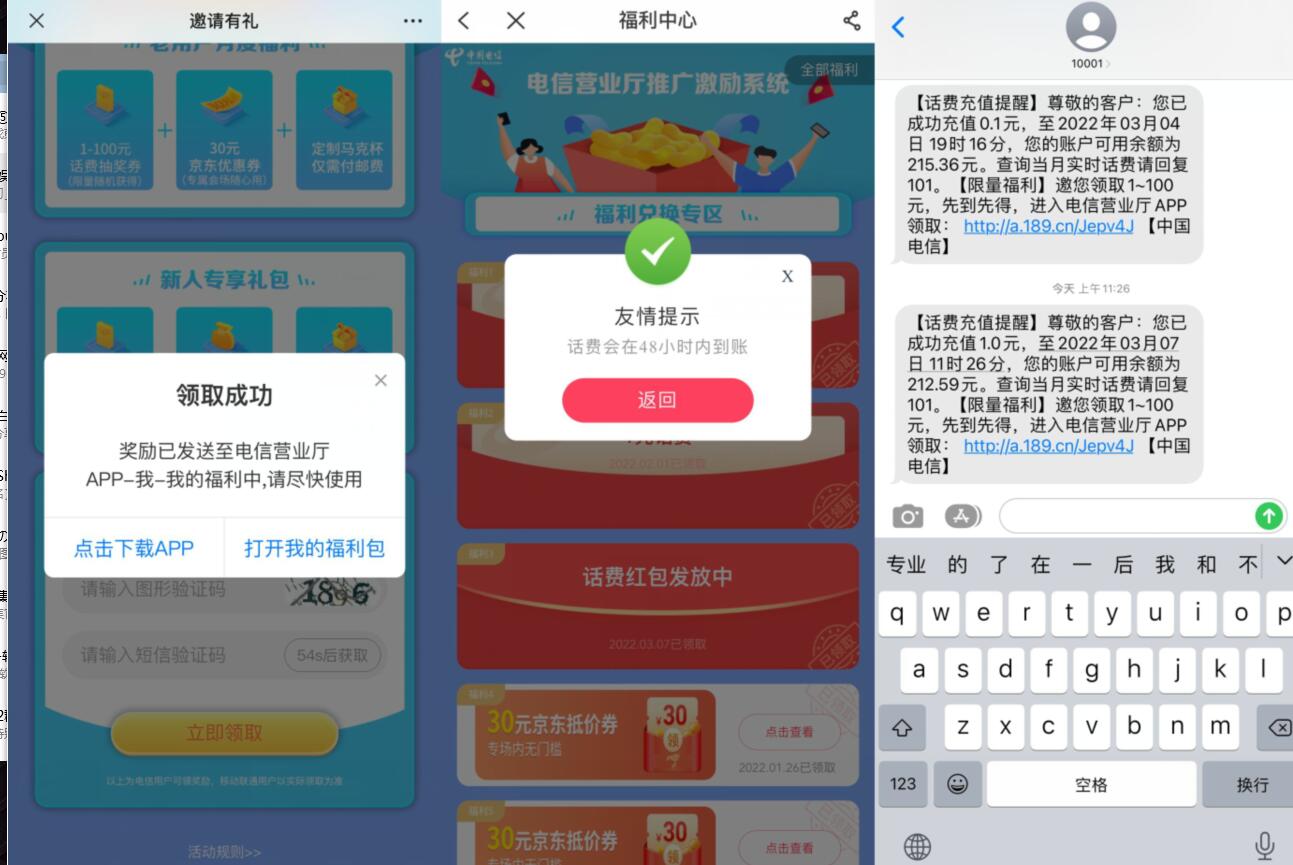 根据提示跳转到电信APP,点击领取->抽1~100元话费