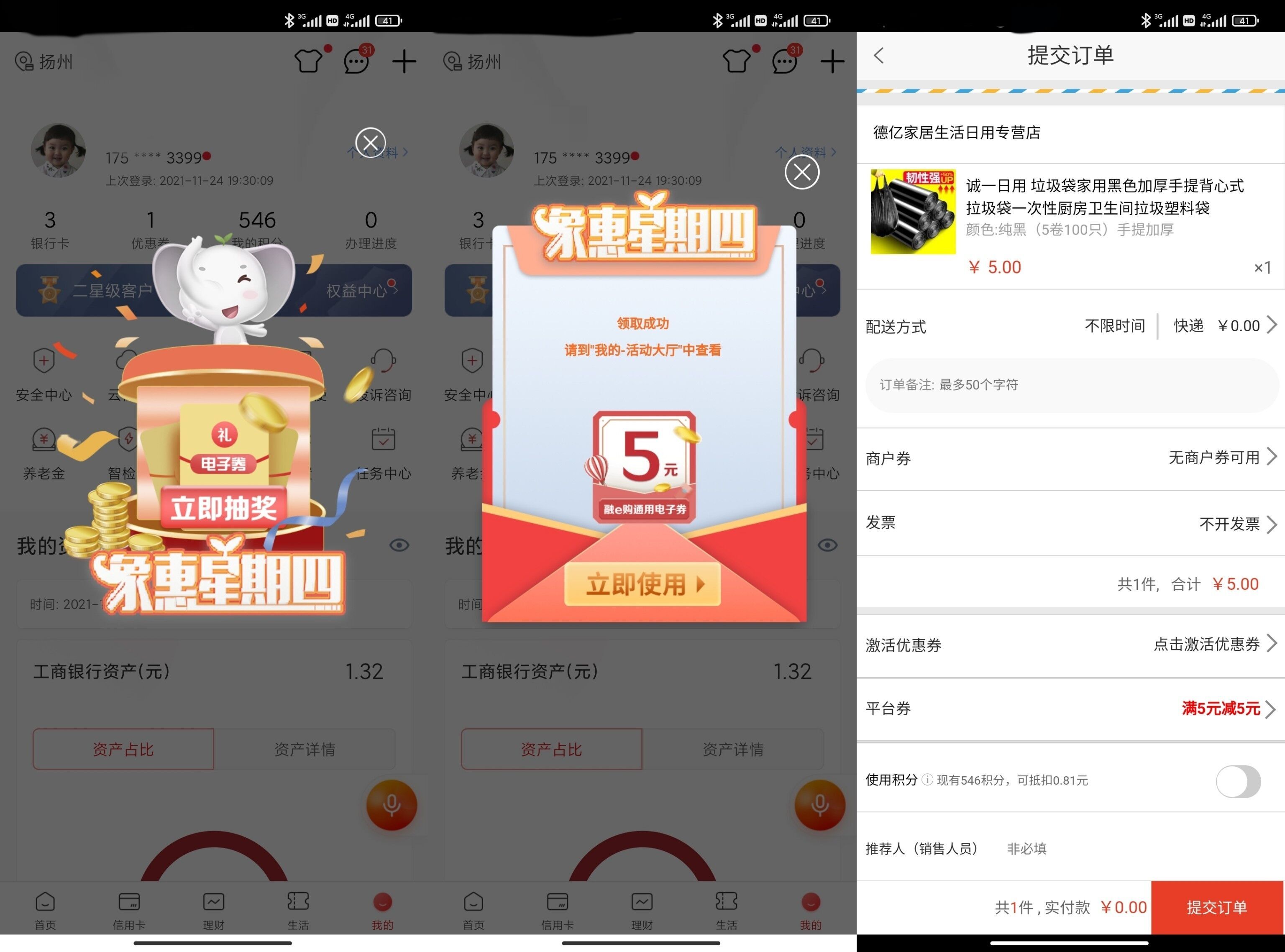 【工行卡抽5~10元实物】打开工商银行APP去->我的->活动大厅->象惠星期四->定向券没有用->然后去首页搜索“网上购物”->点功能进去->中多少面额搜多少的商品(比如5元包邮)->下单就会抵扣!