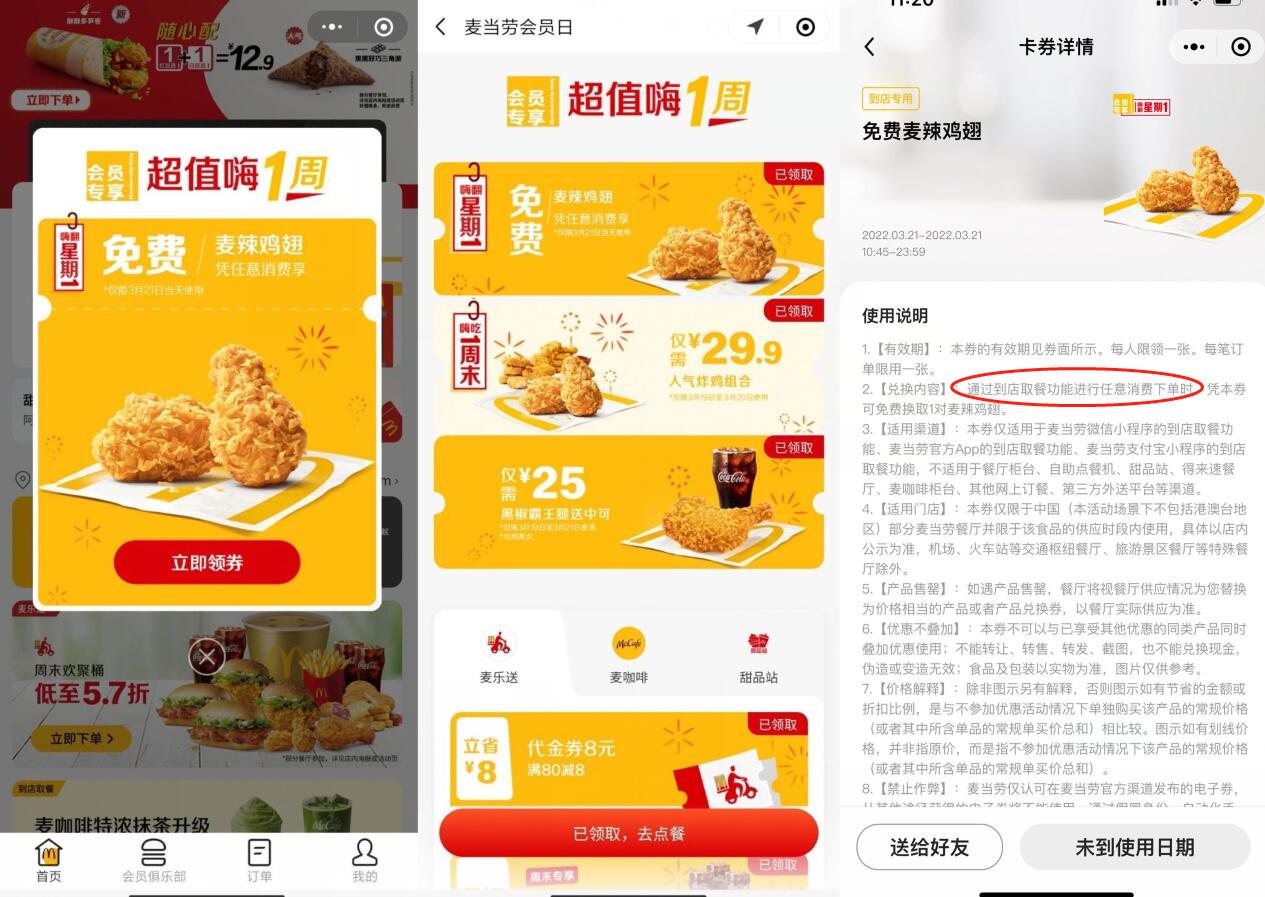 券明天才能使用!附近有麦当劳的上,只能到店使用,