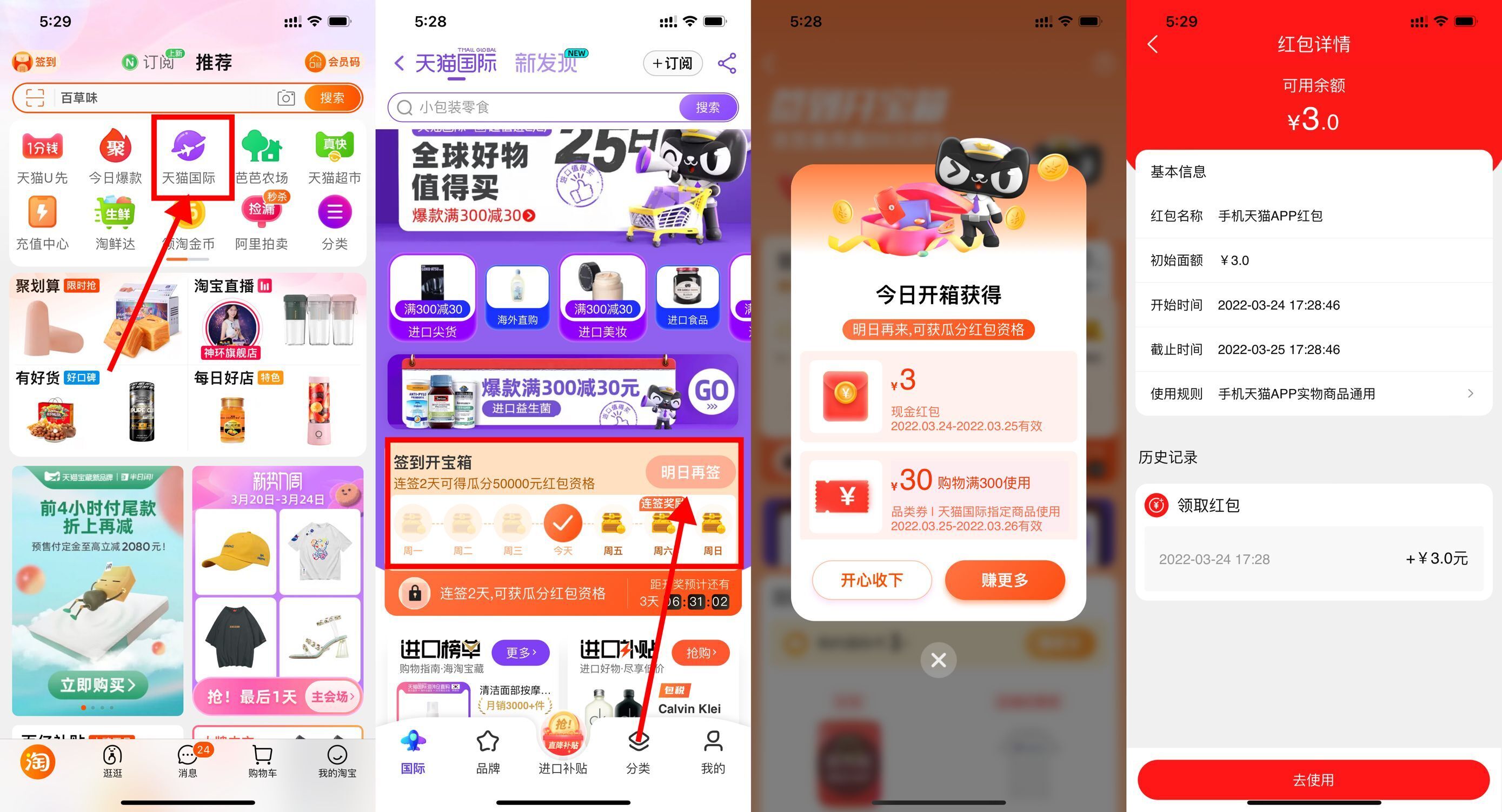 【淘宝部分人领取3~8元天猫红包】手机淘宝APP->首页“天猫国际”->下拉页面->签到开宝箱->签到抽3~8元红包->红包在手机天猫APP购物可用