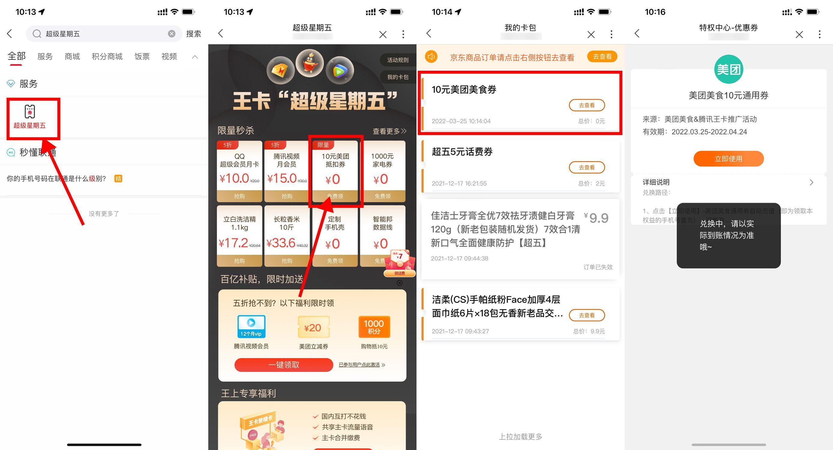 联通APP->搜索“超级星期五”->领10元美团美食券-
