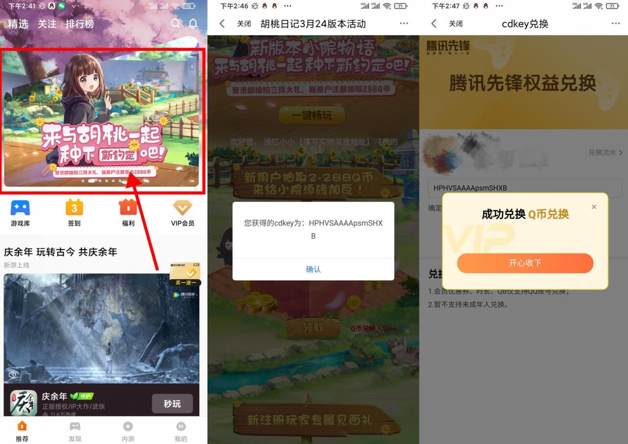 【来与胡桃一起抽2~288Q币秒到】限安卓手机用户参与!应用商店下载“腾讯先锋”APP->首页轮播图“来与胡桃一起”->一键畅玩->QQ授权登录注册->返回页面->领取Q币CDK兑换码->复制兑换码->打开兑换地址兑换