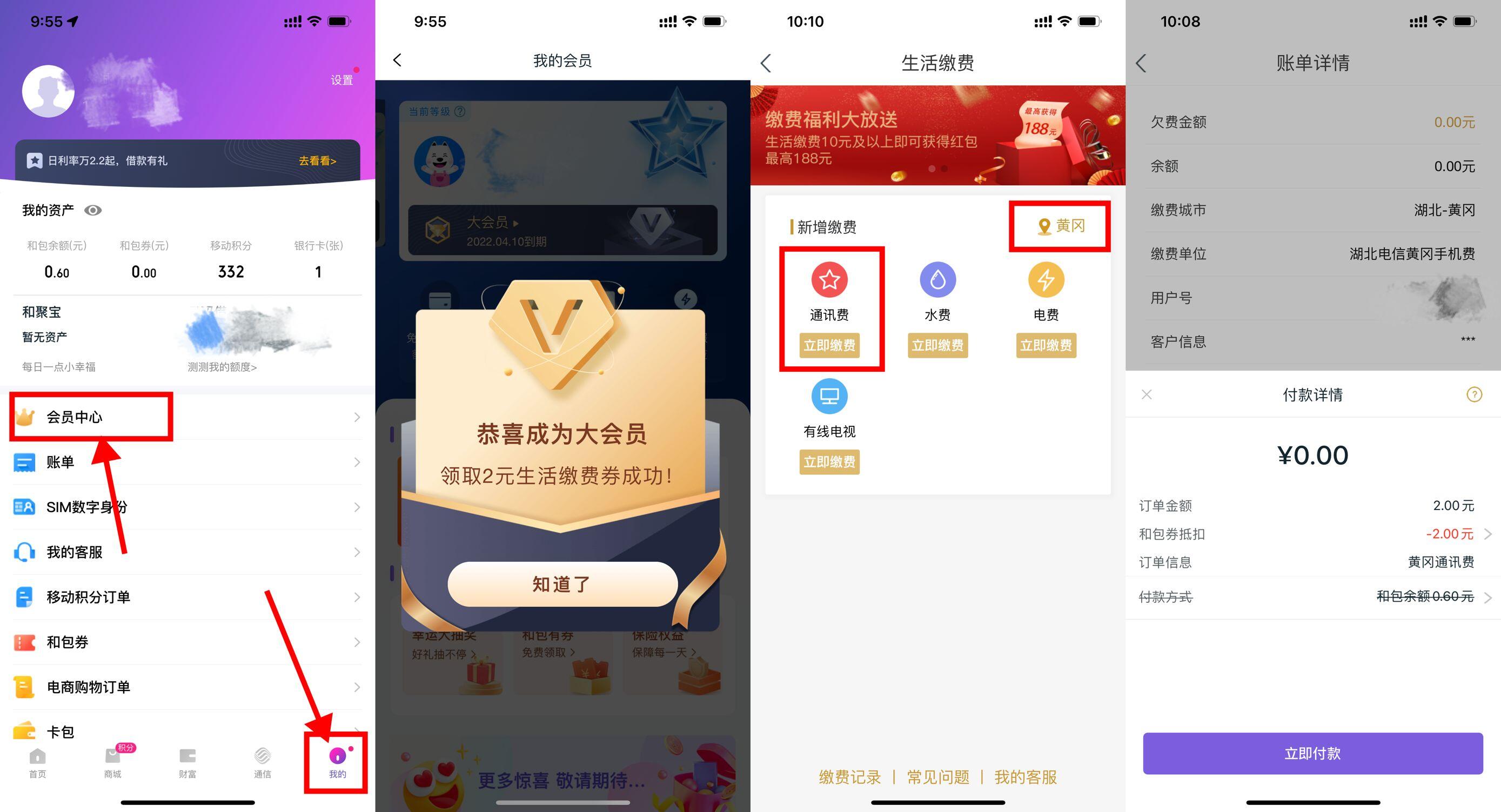 【移动和包老用户领取2元生活缴费券】打开和包APP->我的->会员中心->体验白银会员->领取2元无门槛生活缴费券->首页“生活缴费”->通讯费->部分地区能0充2元话费!