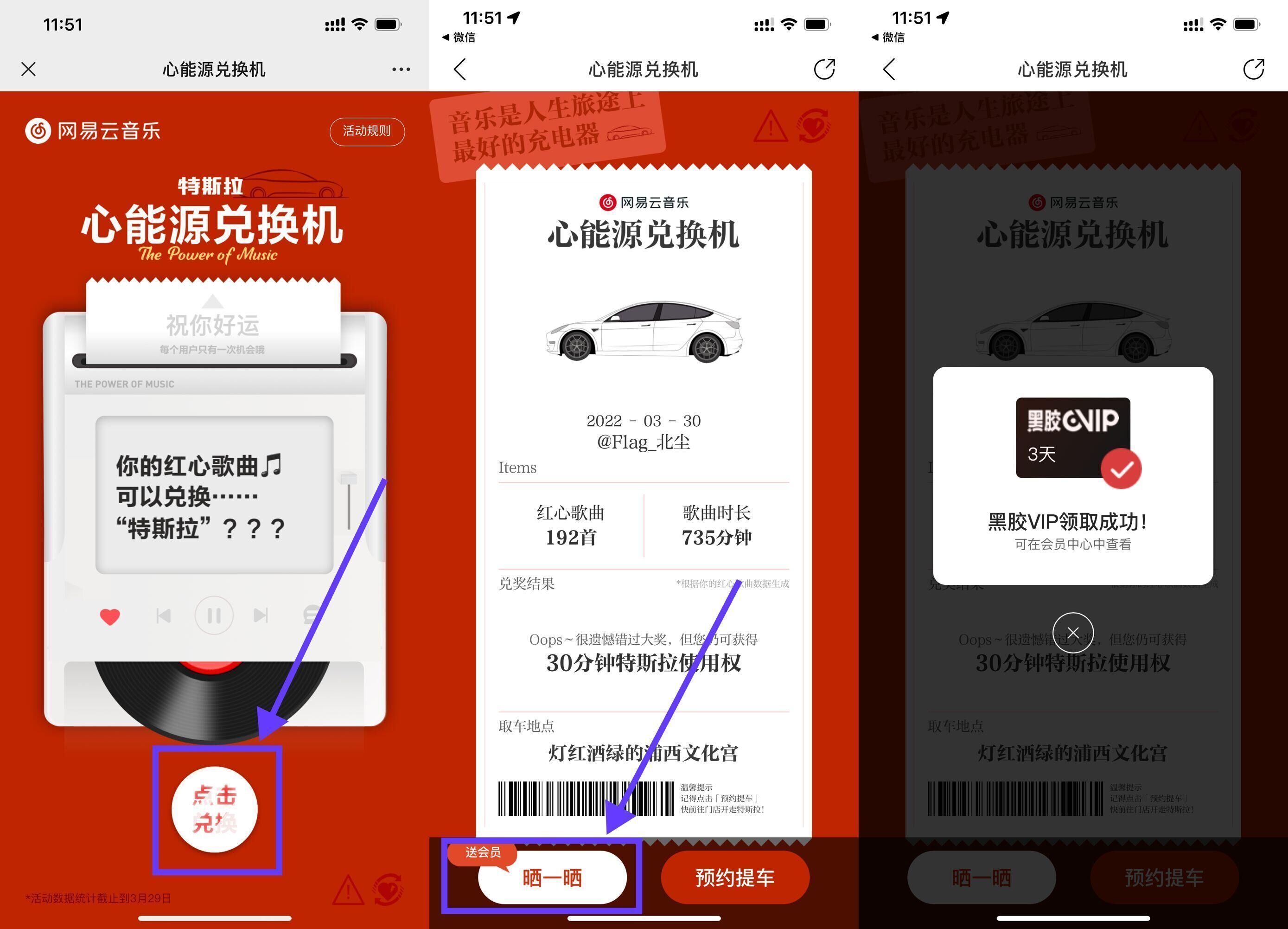 打开地址->跳转到网易云音乐APP->立即兑换->晒一晒->