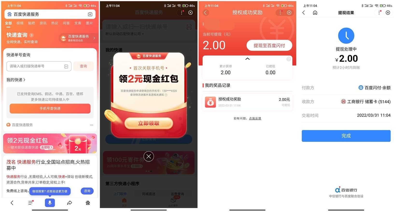 百度快递关联手机领取2元红包
