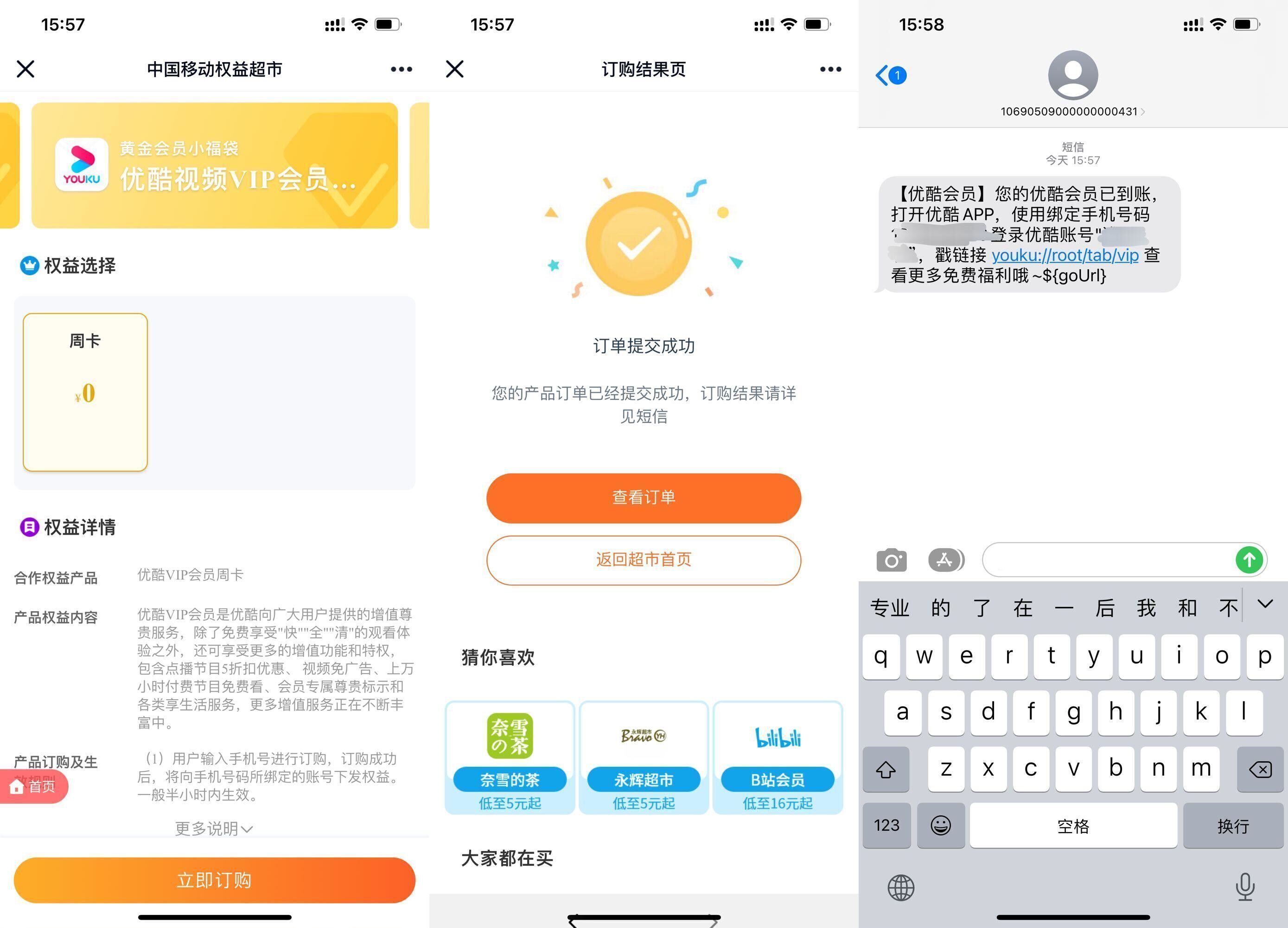 打开地址->使用话费支付0元->秒到优酷会员周卡->直充到账号