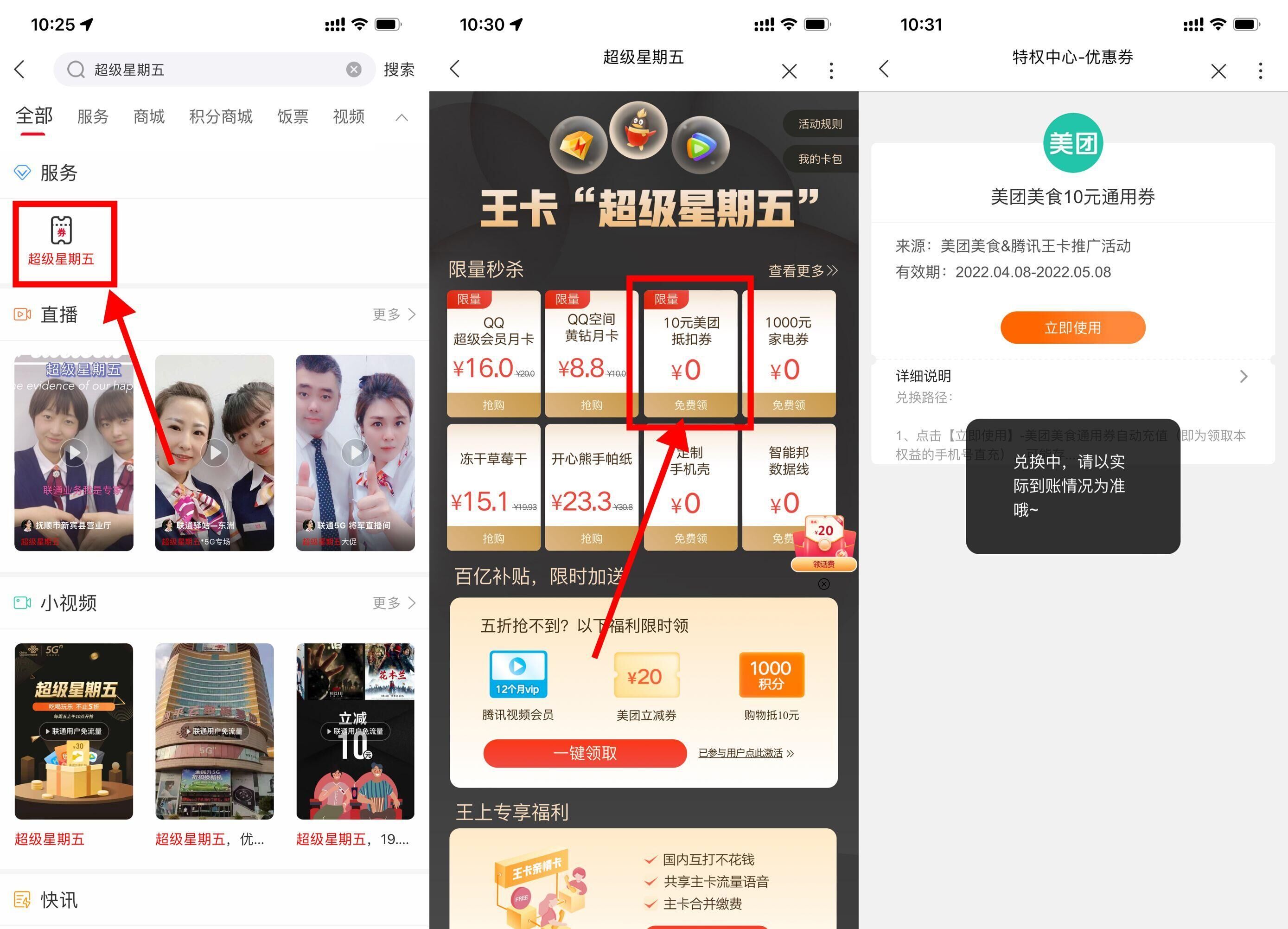 【腾讯大王卡领取10元美团美食券】新一期!限腾讯大王卡用户参与!联通APP->搜索“超级星期五”->领10元美团美食券->根据提示领取到账号