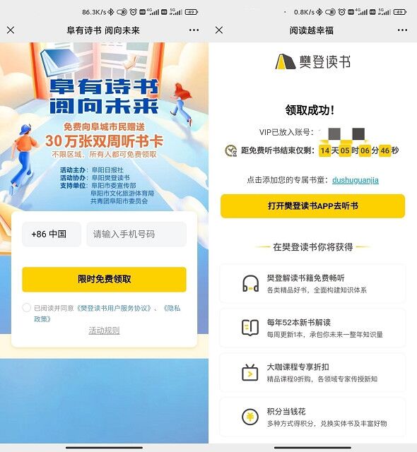 【免费领14天樊登读书会员】提示同类型卡限领一次的话就返回换号领取即可!https://c.dushu365.com/activity/card/index.html?id=5068&activityId=34&randomCode=1GRJH4uXl98SguXOMjn#/home