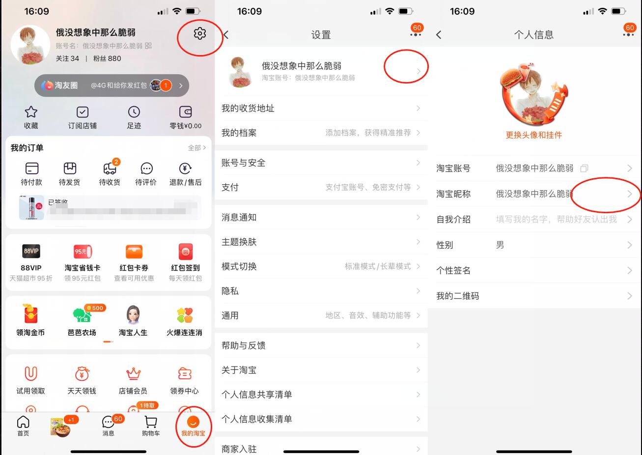 用户名修改路径:手机淘宝APP->我的淘宝->右上角设置->个人信息->点击淘宝账号进入修改