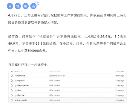 抓获在疫情期间向上海市民售卖抢菜黑客软件的嫌疑人何某。