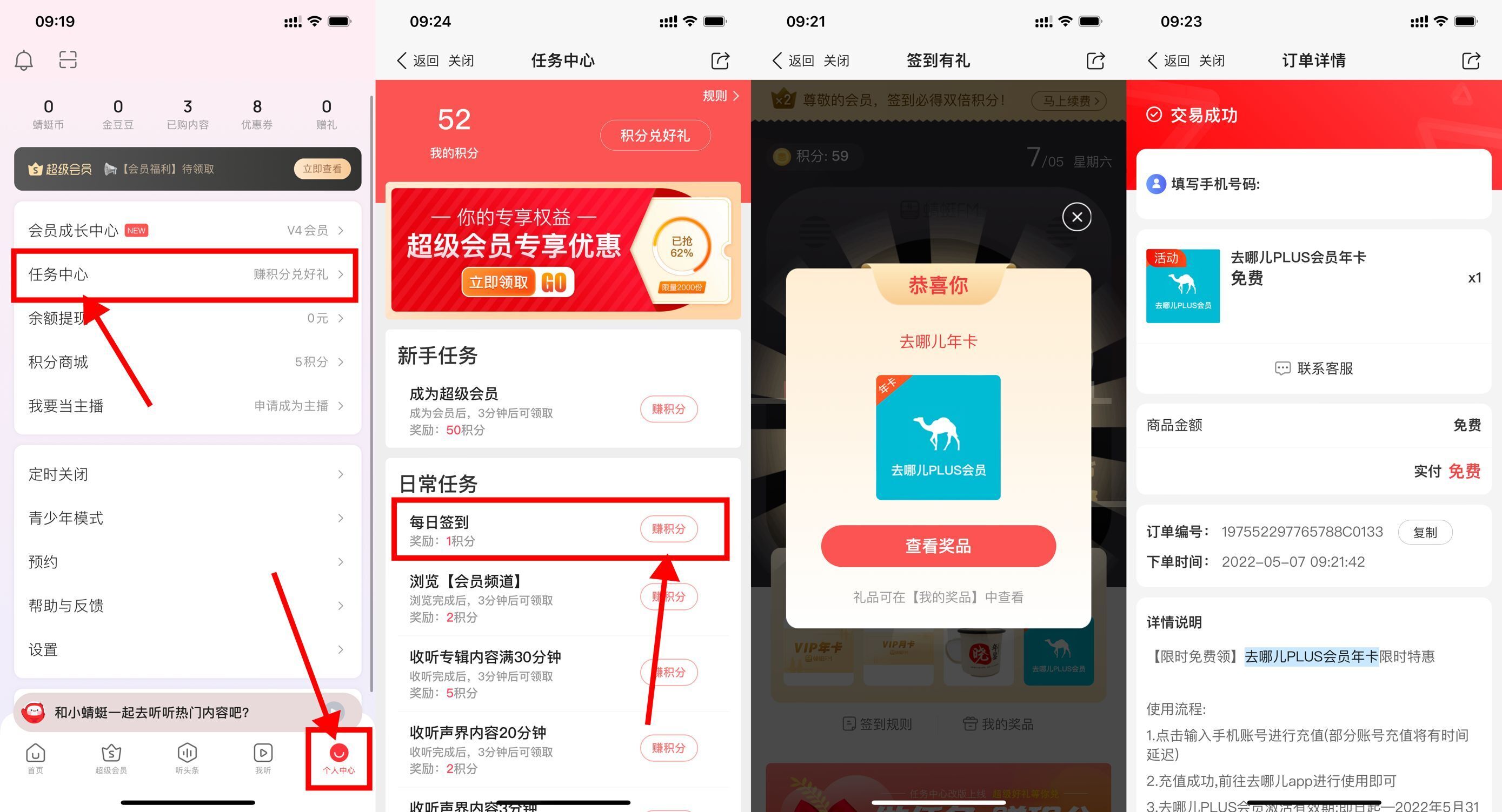 【蜻蜓FM抽去哪儿PLUS会员年卡】蜻蜓FM APP->个人中心->任务中心->每日签到->签到得1次抽奖机会->基本必中去哪儿PLUS会员年卡->输入手机号领取秒到