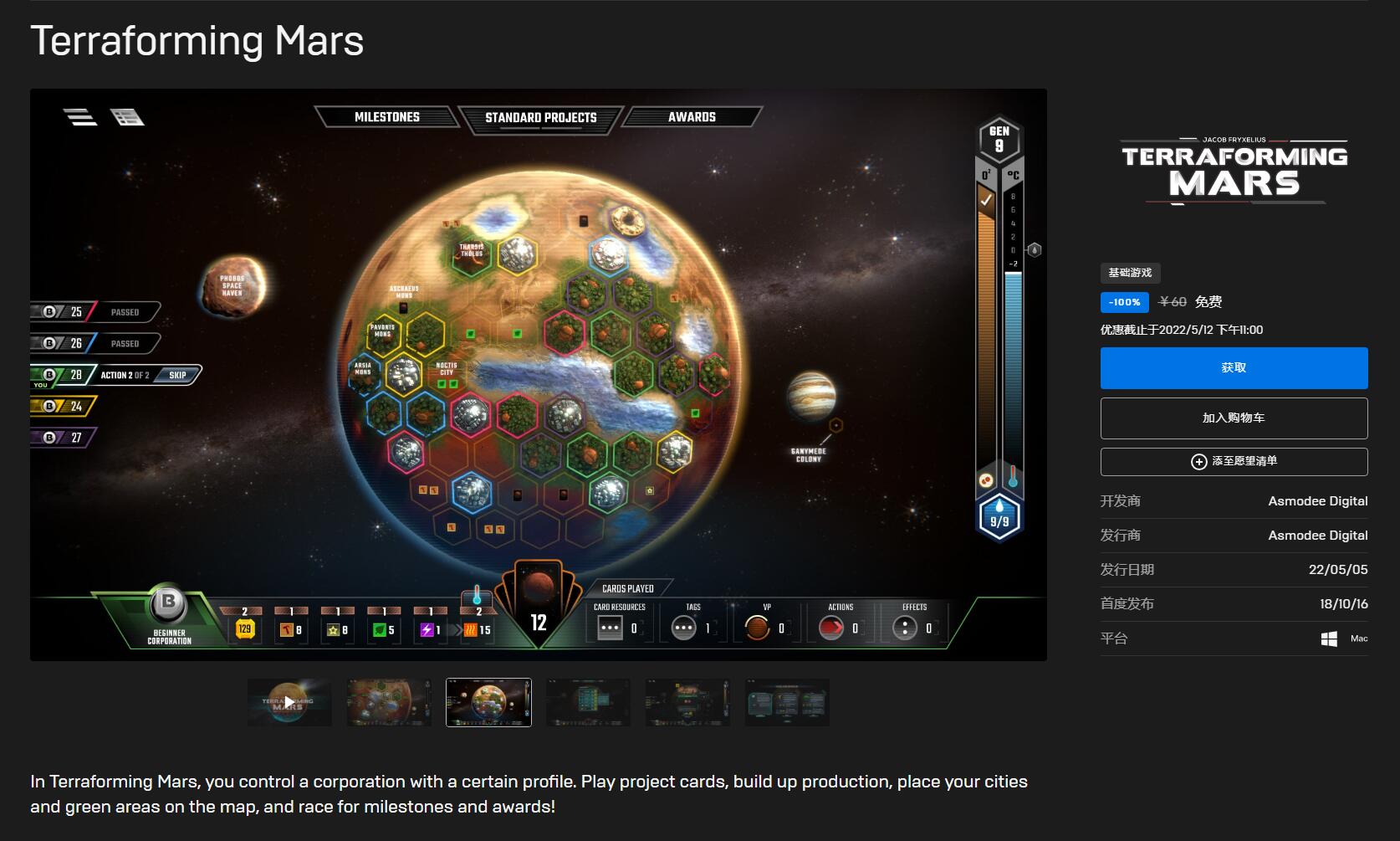 Epic限时免费领《殖民火星》电脑游戏,一款价值60元的策略类游戏,控制一家公司,在火星建立生产,把城市和绿地放在地图上解锁里程碑和奖项。https://store.epicgames.com/zh-CN/p/terraforming-mars-18c3ad