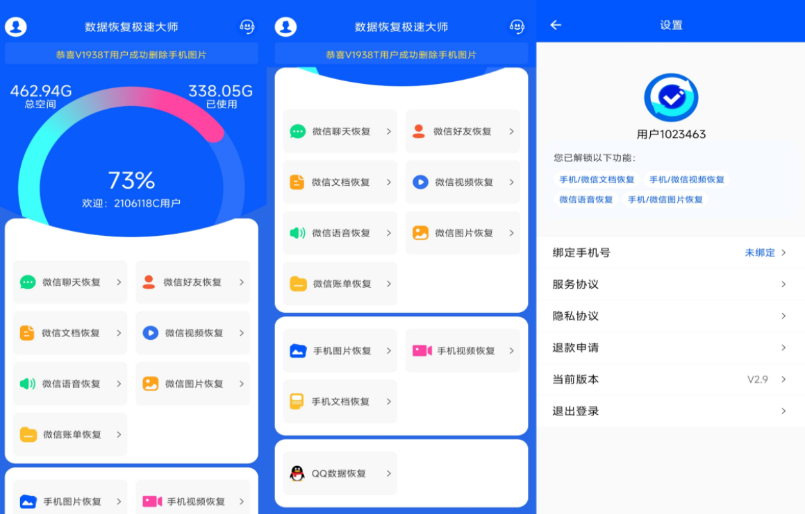 一款的能够帮助广大用户恢复手数据的全新工具软件,软件作非常简单,能够在手上一键恢复误删的数据,聊天记录、视频、照等都可以进行恢复。(解锁部分会员)