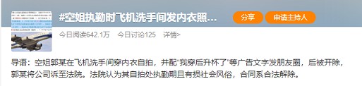 最近一条南航某空姐执勤时,在飞机洗手间发内衣照的消息被顶上热搜,
