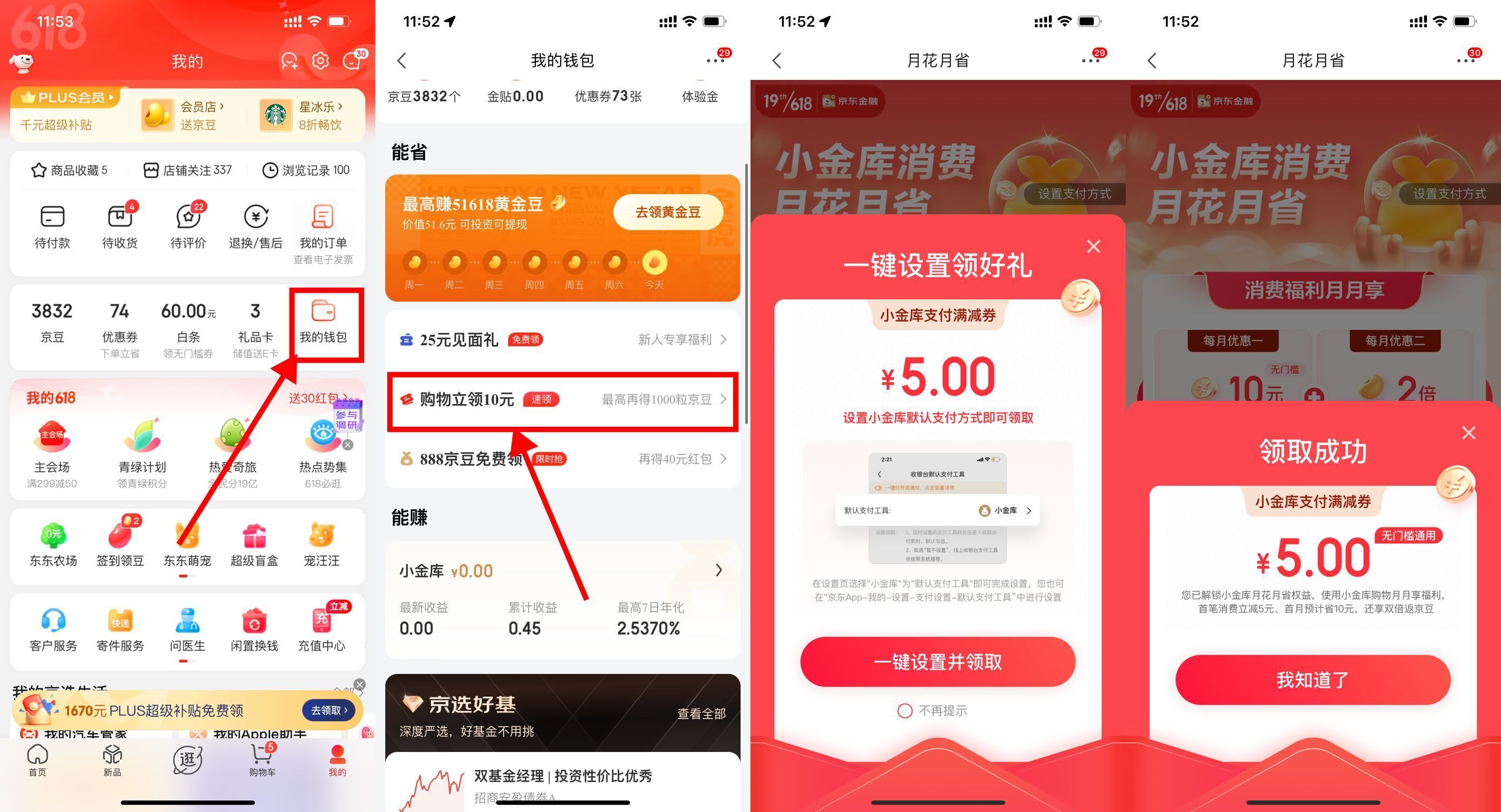 【京东设置支付方式领5元支付券】京东APP->我的->我的钱包->下拉找到“购物立领10元”进入->一键设置并领取->支付券可在京东购物使用小金库支付抵扣