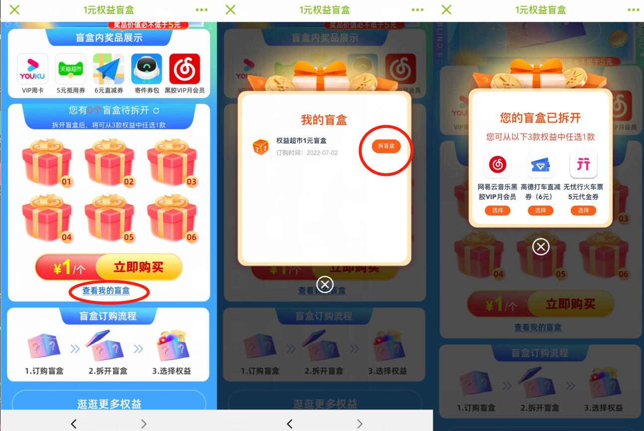 打开地址->支付1元话费抽盲盒->三个选一个领取->