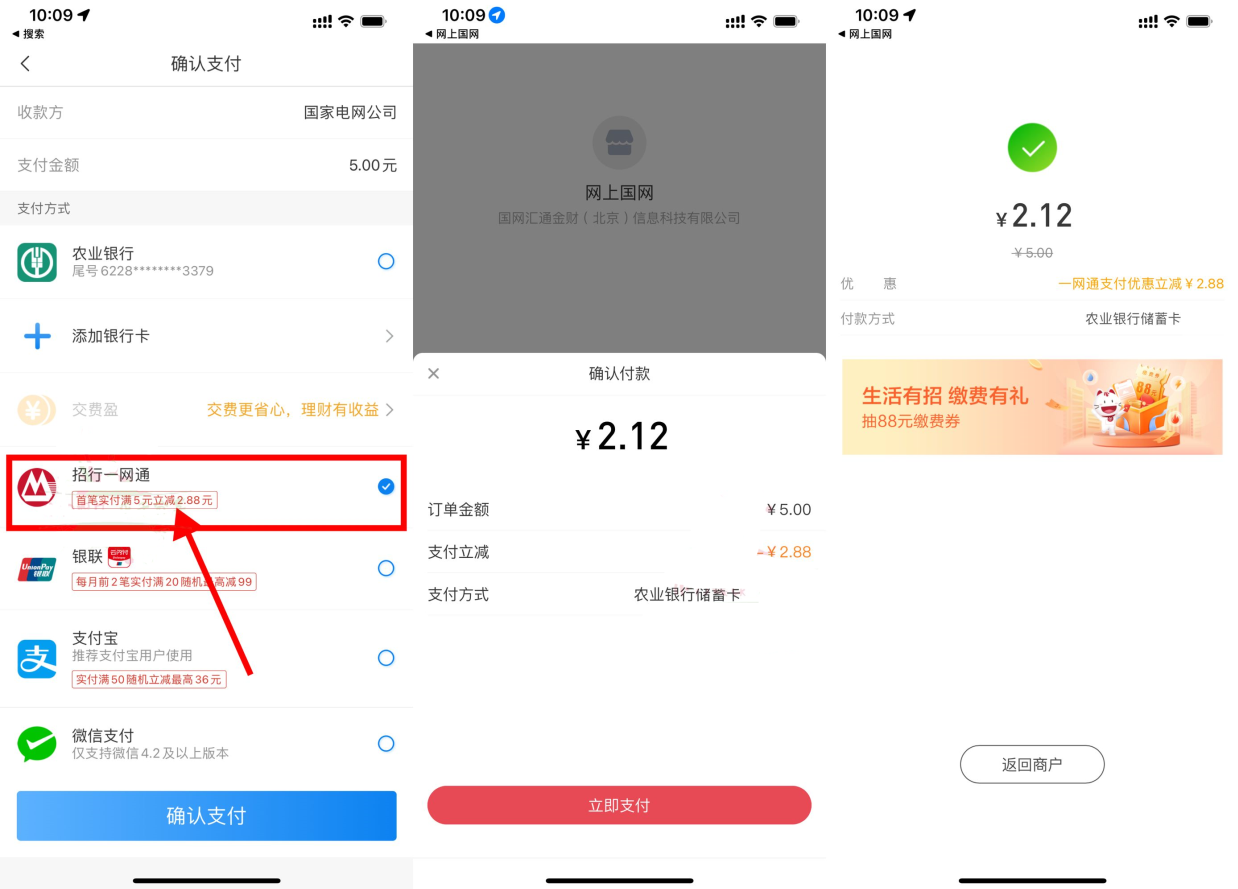 【网上国网电费满5元立减2.88元】新一期,限招行用户参与!网上国网APP->使用招行一卡通缴费->满5元立减2.88元->刚好要充电费的上!