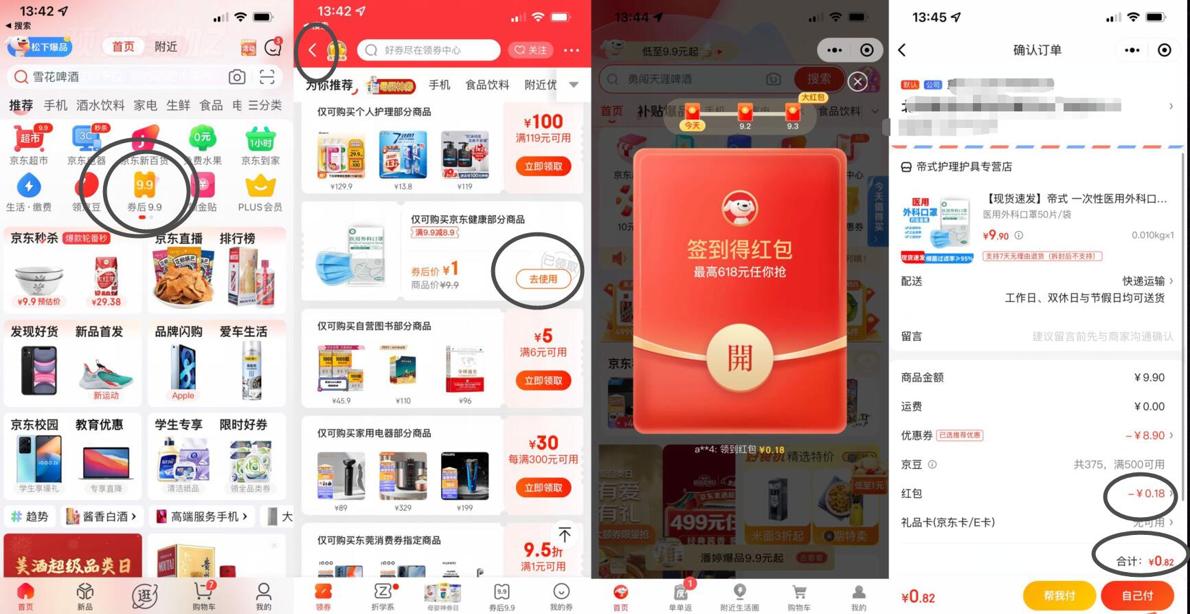 1,京东APP首页“券后9.9或者领券”,进去返回,在下拉领取9.9减8.9元,点使用,把口罩加入购物车