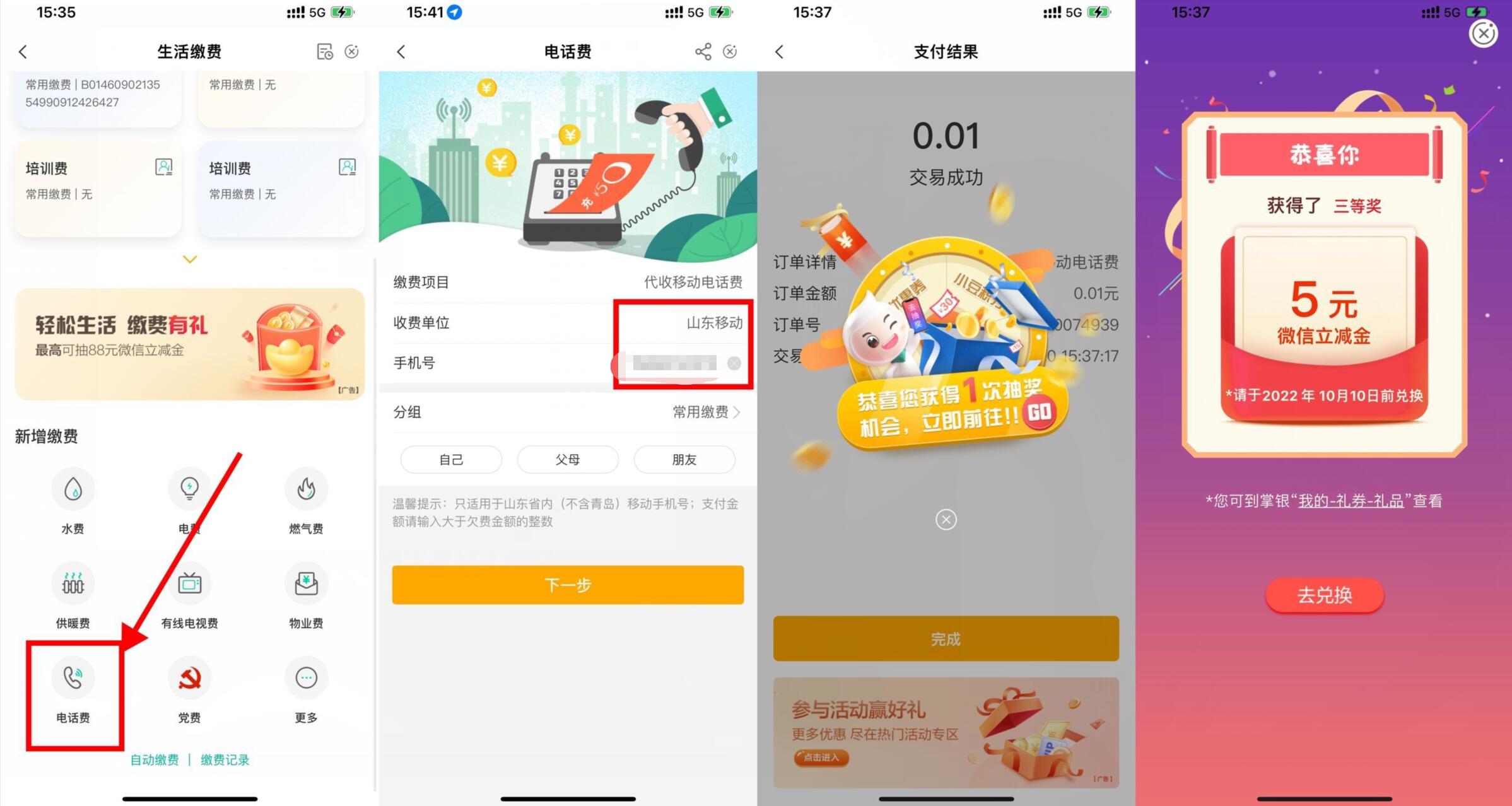 【农行生活缴费抽5~88元立减金】不限地区用户参与!农行APP首页“生活缴费”->左上角搜索“济南”->下拉“电话费”->点击“山东移动”->输入图片上的号码(或者自己找个号码)->缴2次0.01元得2次抽奖机会->目前大水 基本必中立减金!