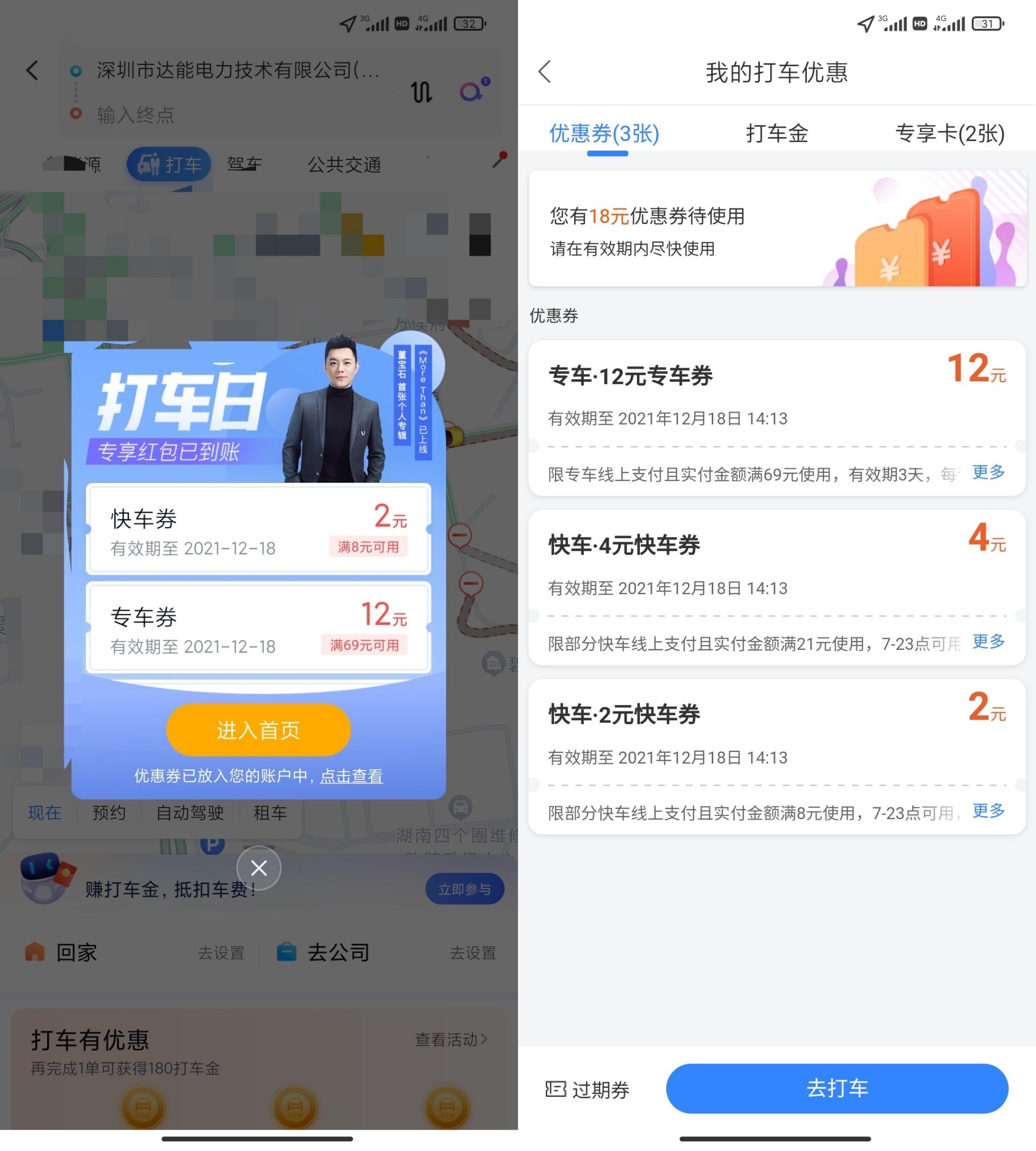 首页搜索:“打车日”亲测4元快车券->打车可直接抵扣使用!