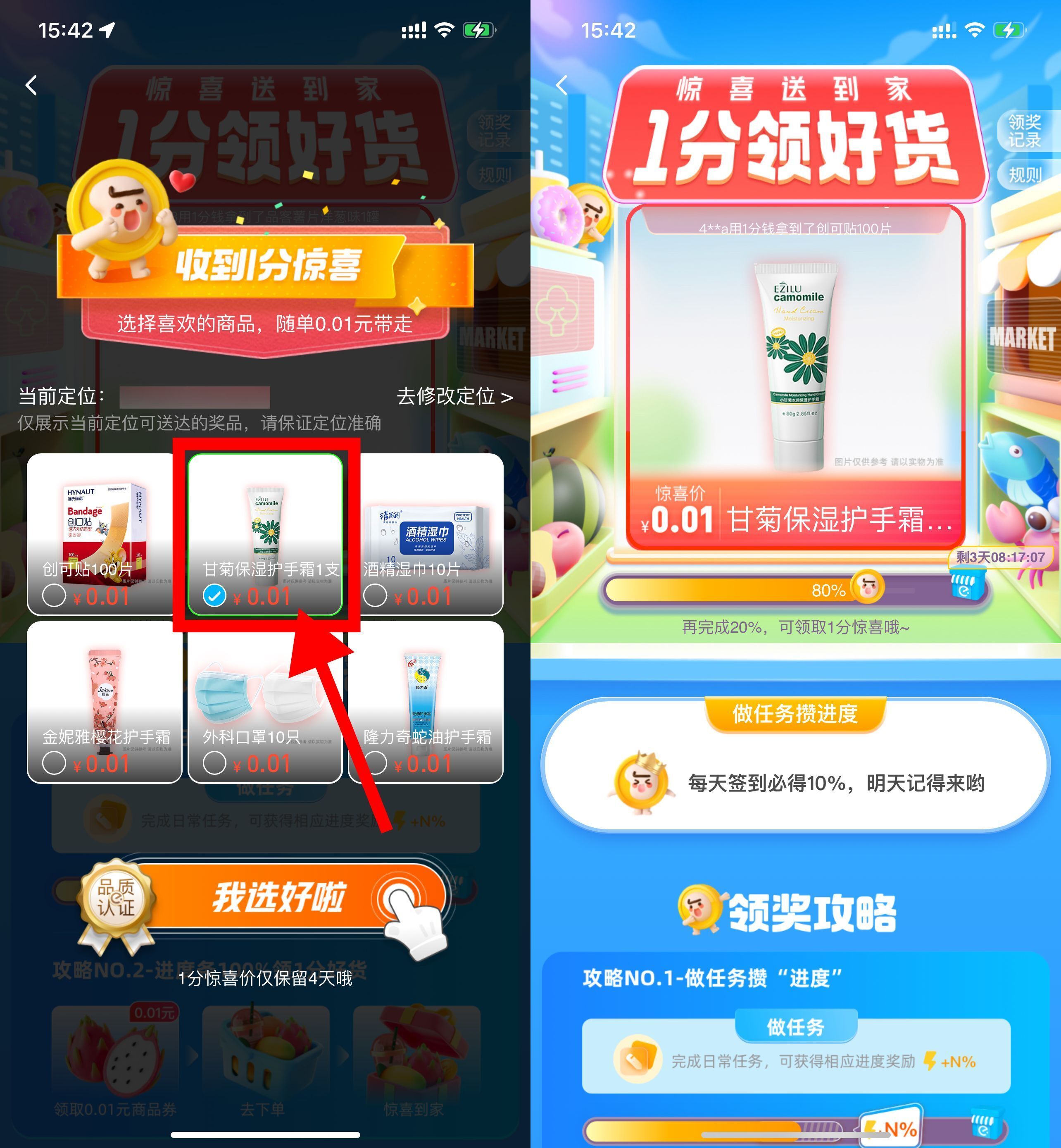 【饿了么签到3天0.01领护手霜】饿了么APP搜索“一分惊喜”->选择图中的甘菊护手霜(其他都要运费)->签到三天支付0.01元包邮到手