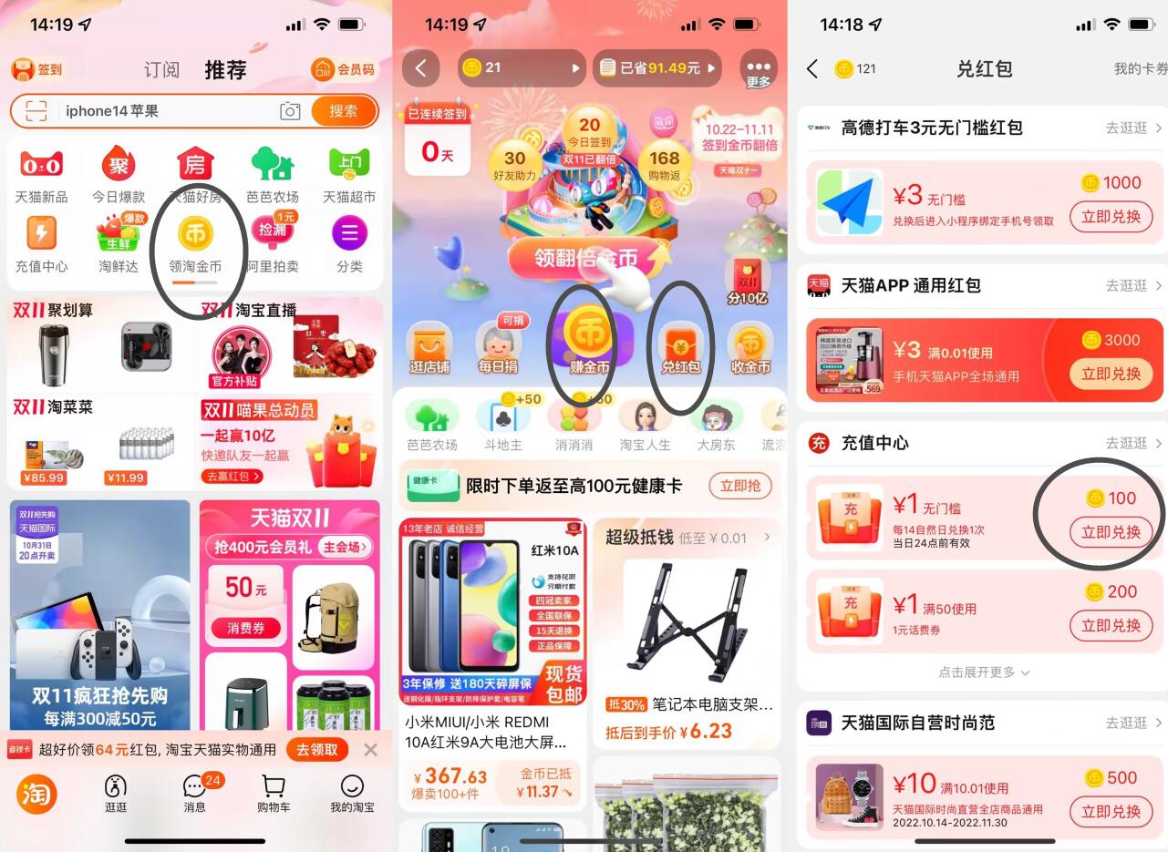 淘宝APP--领淘金币--兑红包--100金币兑1元话费