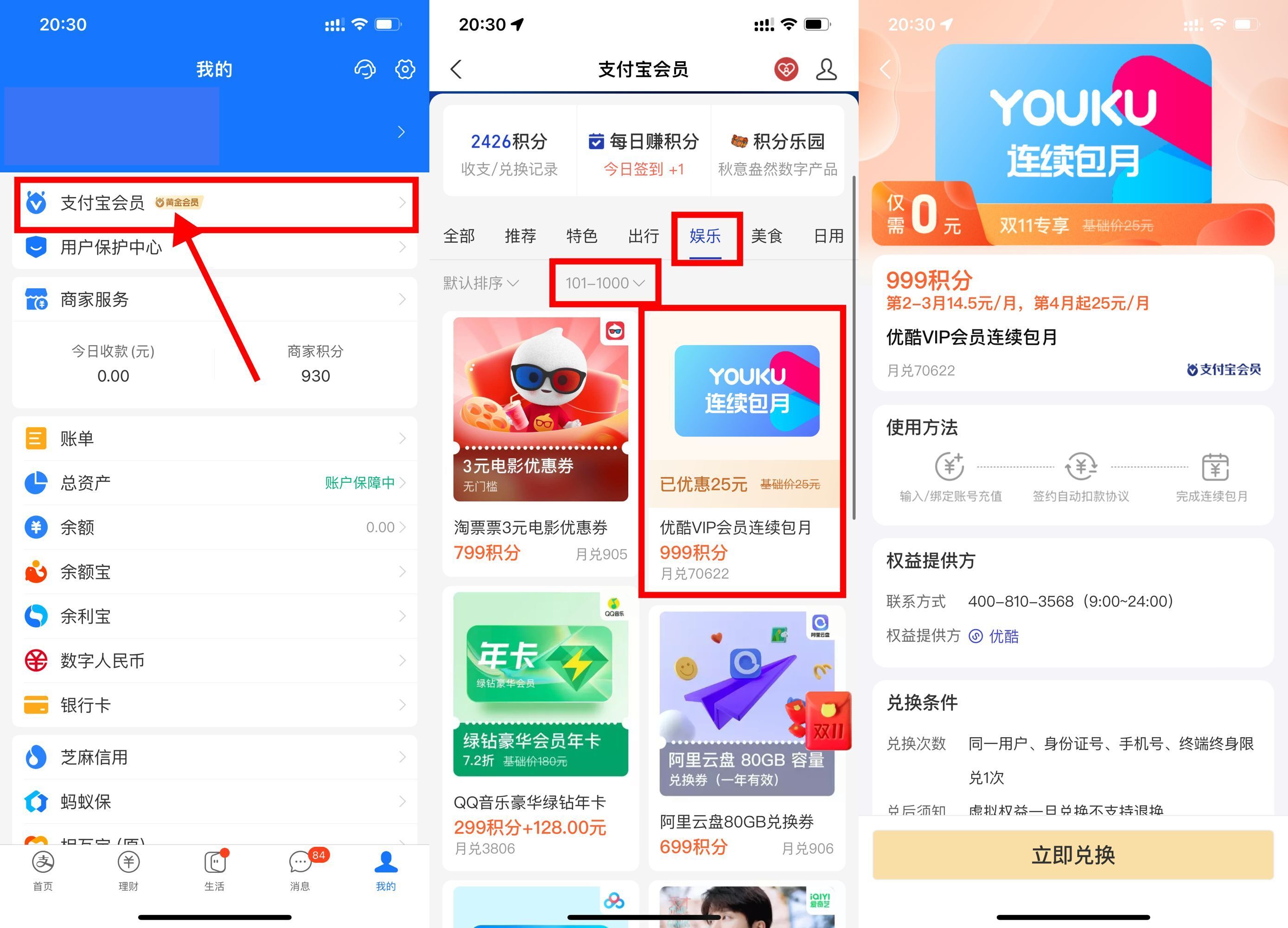 【支付宝999积分兑换优酷月卡】打开支付宝APP->我的->支付宝会员->选择“娱乐”->积分筛选“100~1000”->0元开优酷会员月卡->最后去支付设置里取消自动续费即可!